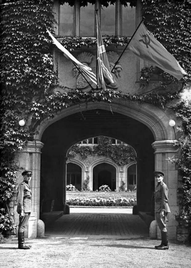 Главный вход на территорию дворца Цецилиенхоф — места проведения 17 июля – 2 августа 1945 года Потсдамской конференции лидеров трех крупнейших держав антигитлеровской коалиции во Второй мировой войне. Вход охраняют военнослужащие войск НКВД СССР. Над аркой входа за государственными флагами стран — участниц конференции видны гербы (бранденбургский орел и мекленбургский бык) бывших владельцев дворца, кронпринца Вильгельма и его супруги Цецилии Мекленбург-Шверинской.