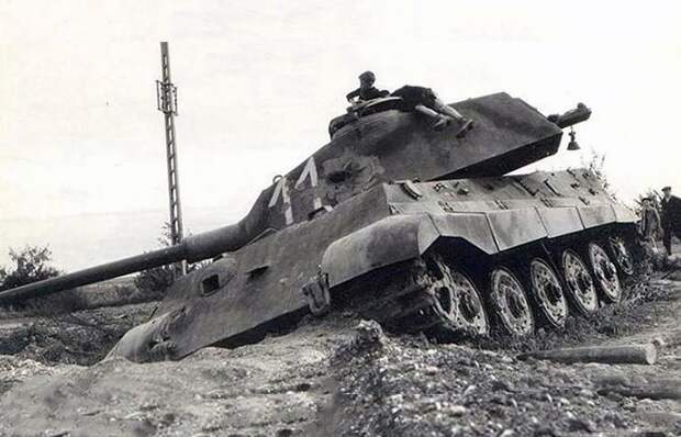 Выпущено было чуть меньше 490 машин — по меркам войны это капля в море, но каждая из них обрастала слухами. В немецкой армии Tiger II сводили в отдельные тяжёлые батальоны, предназначенные для решающих ударов и обороны ключевых участков. В теории всё выглядело внушительно: мощное орудие, толстая броня и психологический эффект, который танк производил одним своим появлением. Вот только за потрясающими характеристиками скрывались серьёзные минусы: тяжёлая трансмиссия и сложная ходовая часть не выдерживали долгих переходов, огромный расход топлива — до 500 литров на 100 км — делал танк буквально привязанным к колоннам снабжения, а малый запас хода мешал вести затяжные бои вдали от баз. Высокая цена и сложность производства не позволяли быстро восполнять потери. Tiger II с самого начала был очень сложным и спорным танком, и познакомившись с ним поближе, советские инженеры быстро разобрались, в чём были его главные проблемы.