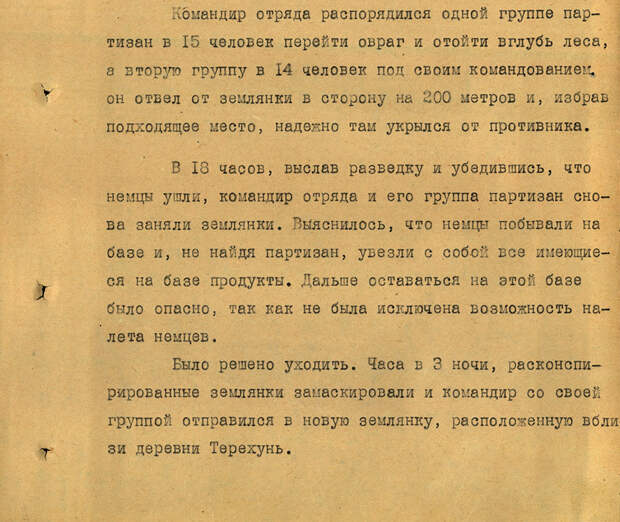 Партизаны решили отойти от лагеря на 200 м и спрятаться в лесу. К вечеру они вернулись на базу и поняли, что немцы там уже побывали — увезли все продукты. Советским бойцам оставалось уходить в запасной лагерь, оставив у раскрытой землянки двух караульных. Вернуться живым смог только один.