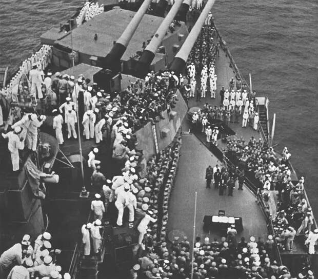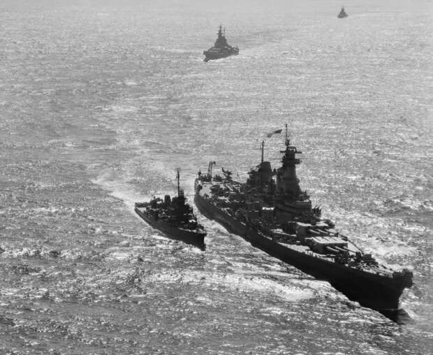 Американский линкор «Миссури» входит в Токийский залив для проведения церемонии подписания капитуляции Японии. По правому борту от «Миссури» идет эсминец «Николас». Позади «Миссури» идут американский линкор «Айова» и британский линкор типа «Кинг Джордж V». 30 августа 1945