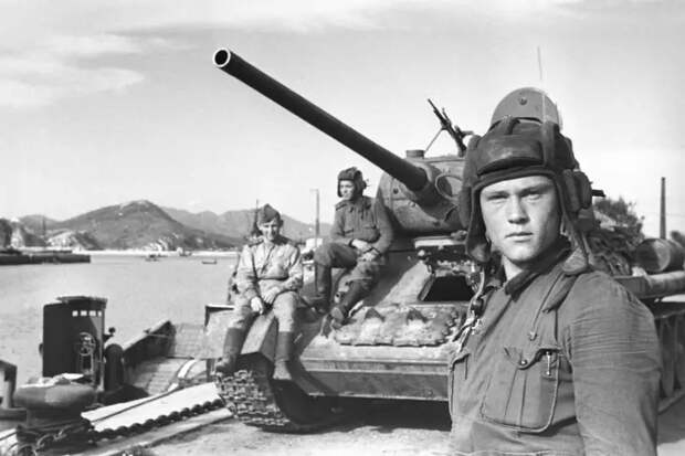 Командир танка Т-34-85 гвардии лейтенант Василий Сарафанов в Порт-Артуре. Василий Иванович Сарафанов (1924 — 1960) участник войны с 15 августа 1943 года. В составе 29-й отдельной гвардейской танковой бригады, а позже 78-й отдельной танковой бригады, воевал на Брянском и 2-м Прибалтийском фронтах. В войне с Японией принимал участие в составе 21-й гвардейской танковой бригады. Награжден орденами Отечественной войны 1-й и 2-й степеней, двумя орденами Красной Звезды, медалями «За победу над Германией» и «За победу над Японией»
