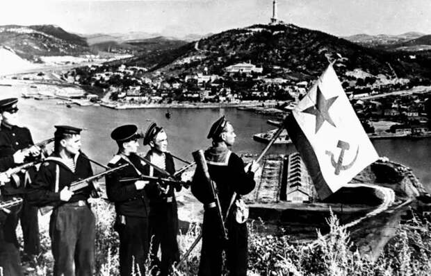 Моряки-десантники Тихоокеанского флота на пути в Порт-Артур. На переднем плане участница обороны Севастополя, десантник Тихоокеанского флота Анна Юрченко