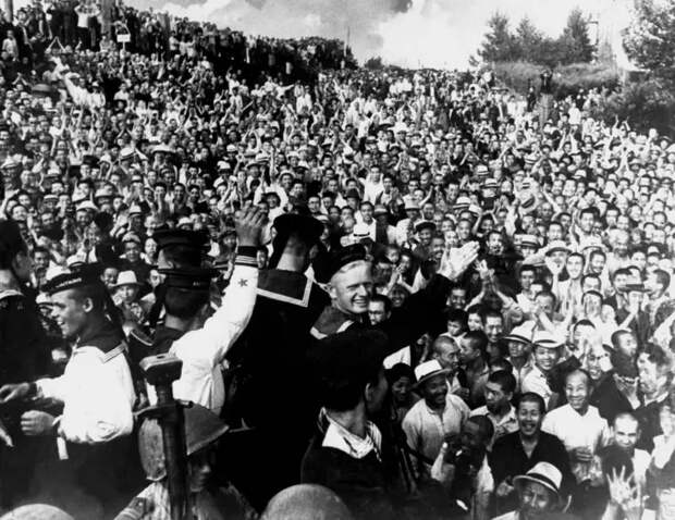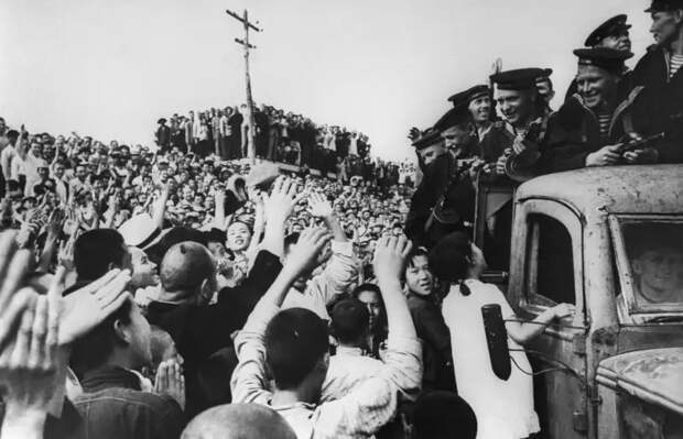 Население Харбина встречает советских военнослужащих. Появление советских войск означало конец существовавшего здесь государства Маньчжоу-го, образованного и контролировавшегося Японией.