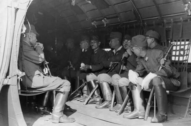 Японские генералы на борту советского самолета (вероятно, в транспортном самолете в ожидании отправки в тыл. Аэродром Мукден.