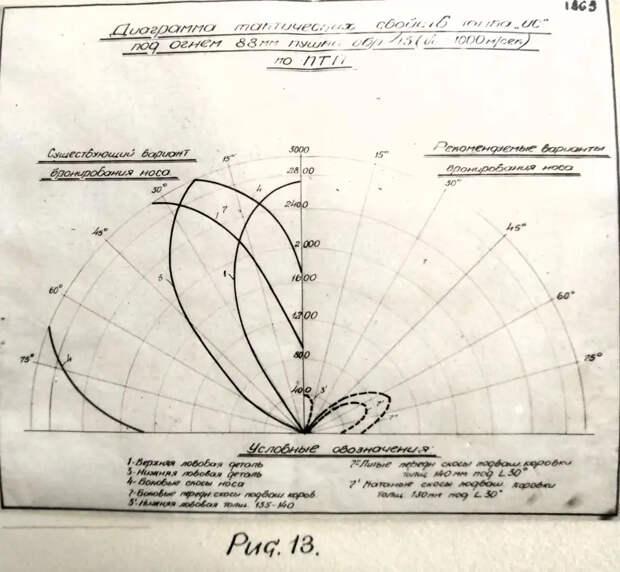 «Наилучшим вариантом такого изменения является замена литого носа сварным на катаных деталях с ВЛД толщиной 90 мм при угле наклона 60 градусов, НЛД толщиной в 135 мм при угле наклона 30 градусов и литой подбашенной коробкой с верхними боковыми скосами толщиной 140 мм и углом наклона от вертикали 30 градусов. Остальные детали подбашенной коробки остаются без изменений, как и в существующей конструкции. Предлагаемая конструкция носа может быть выполнена также литьем, но с утолщением ВЛД до 100 мм и НЛД до 145 мм.»