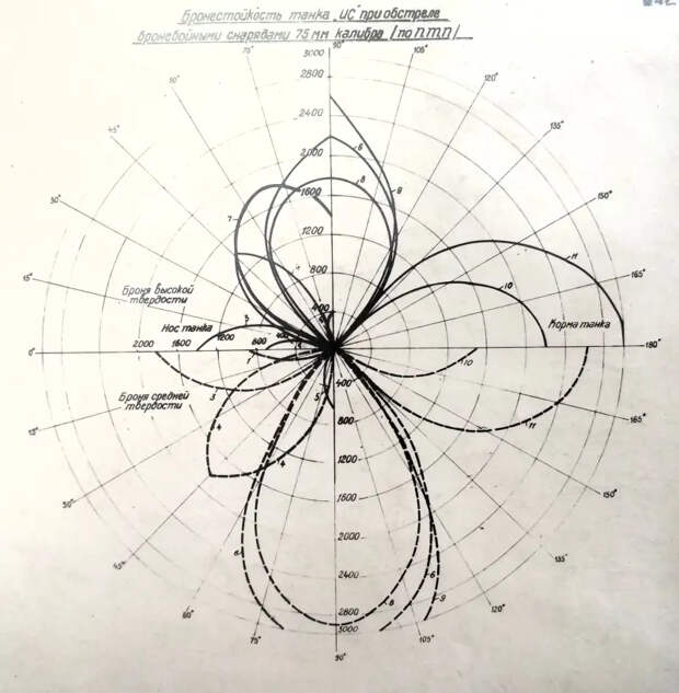 По расчётам, ослабленные зоны корпуса танка пробивались 75-мм и 88-мм снарядами с курсовых углов 75-105 градусов и дистанции в более 3 километров. Выявленные на математическом уровне недостатки бронирования танка требовалось в кратчайшие сроки исправить. Напомним, что в ЦНИИ-48 на тот момент исследовали только корпус танка ИС. На долгие годы квинтэссенцией советского подхода к компоновке танка стала фраза в выводах: